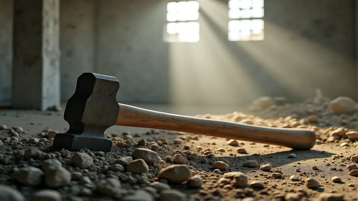Rüyada balyoz görmek; yıkılmış betonlar üzerinde duran ağır bir balyoz, güç ve değişim sembolü.